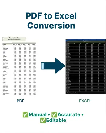 I will accurately convert your PDF files into fully editable Excel sheets. You will receive a clean, well-organized Excel file with correct formatting, formulas (if needed), and proper data structure. This service saves your time and makes your data easy to edit, analyze, and use for reports or calculations.