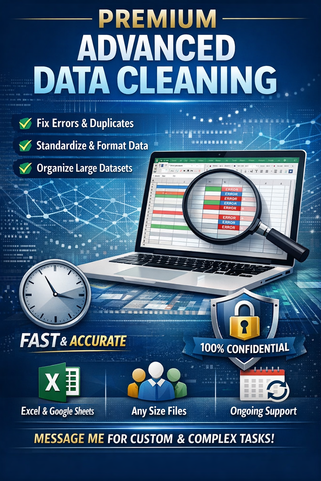 I will clean, format, and organize your large or complex Excel or Google Sheets data to make it accurate, readable, and ready for analysis or reporting. If your spreadsheet is messy, inconsistent, or difficult to use, I will transform it into a clean, professional, and well-structured file.