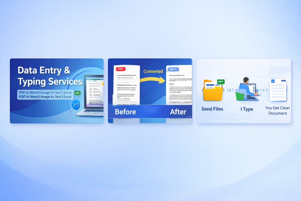 My services include PDF to Word typing, image to Word typing, handwritten notes typing, copy paste work, Excel data entry, and document formatting. I make sure that the final document is clean, professional, and easy to read.