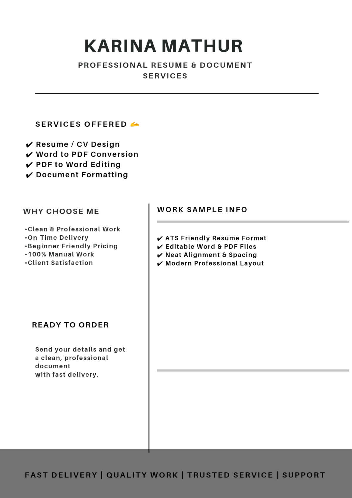 I am a dedicated freelancer providing professional resume and document services. I focus on clean formatting, ATS-friendly resumes, accurate document conversion, and on-time delivery. Client satisfaction is my priority.