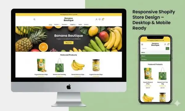 Shopify store setup, free theme, homepage layout, 3 product uploads, navigation, payment gateway, and mobile-responsive design.