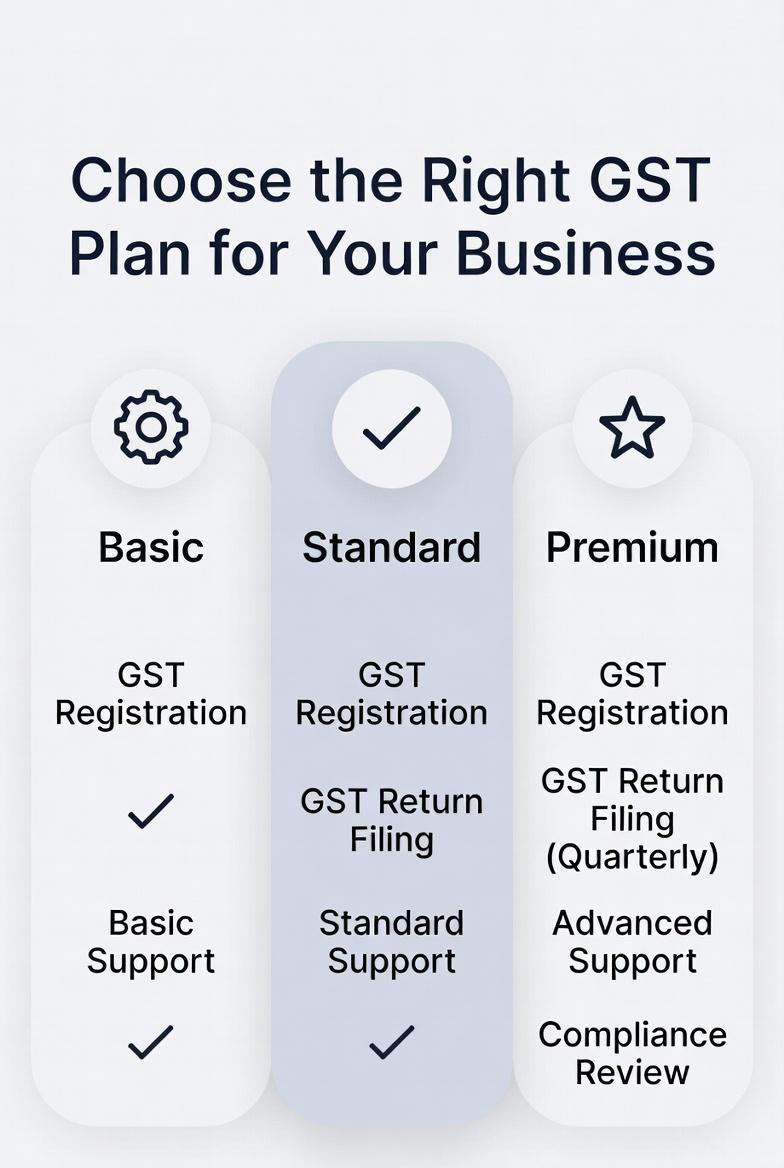 GST Registration OR ✔ Nil GST Return Filing (GSTR-1 / GSTR-3B) ✔ Basic document verification ✔ Email / platform support Best for small businesses & nil returns