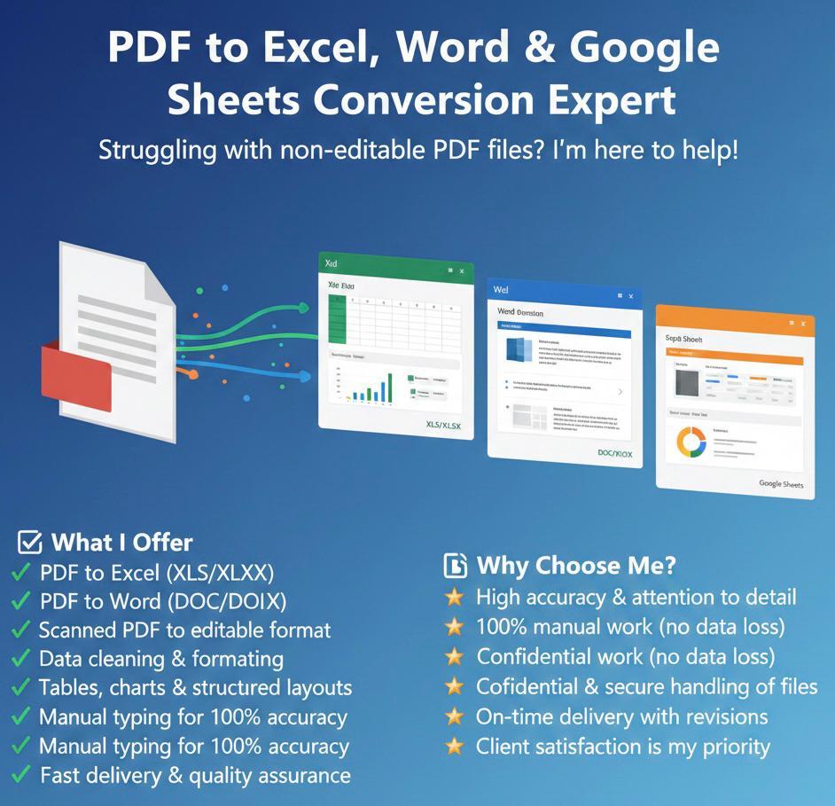 Struggling with non-editable or scanned PDF files that you can’t modify or reuse? You’re in the right place. I specialize in converting PDF documents into fully editable Excel, Word, and Google Sheets with high accuracy, clean formatting, and proper data structure.