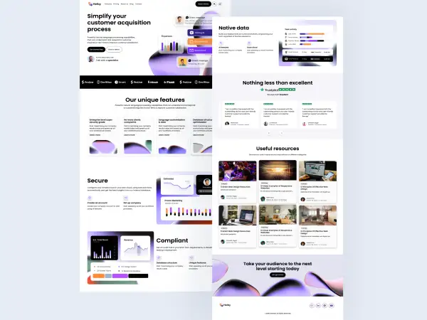 The page features a strong and engaging hero section that immediately communicates the product’s value, followed by well-organized feature highlights that explain core functionalities in a simple and visually appealing way. Data visualization blocks are used to present insights clearly, while customer testimonials help build trust and credibility. Resource cards provide easy access to useful content, and strategically placed call-to-action sections guide users toward conversions.