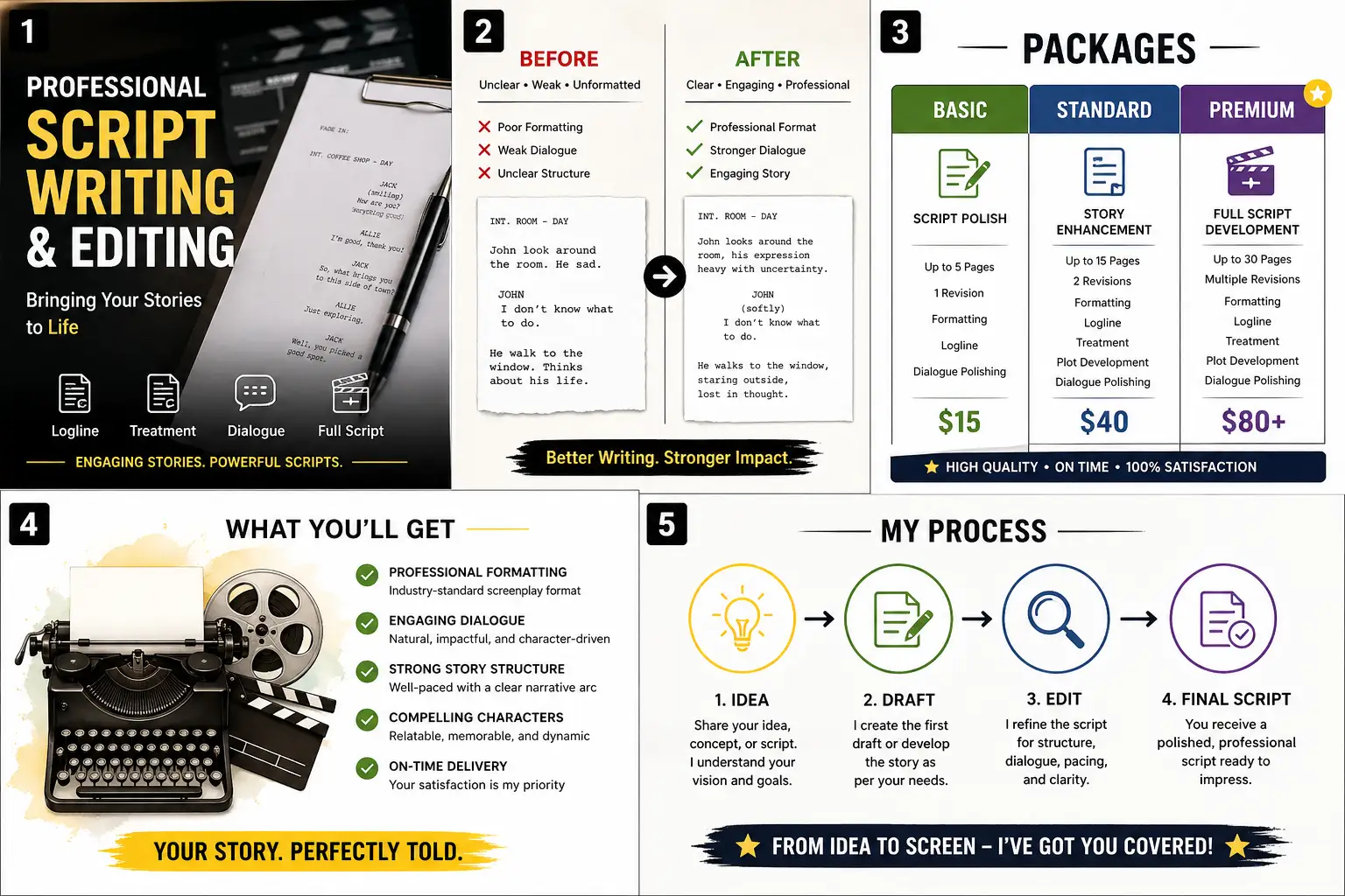 Before I begin writing, I take time to understand your concept, target audience, tone, and preferred style. This allows me to deliver a script that meets your expectations and reflects your vision accurately. If you already have a story idea, I will develop it into a polished script. If you do not have a fully formed concept, I can create an original storyline based on your requirements.
