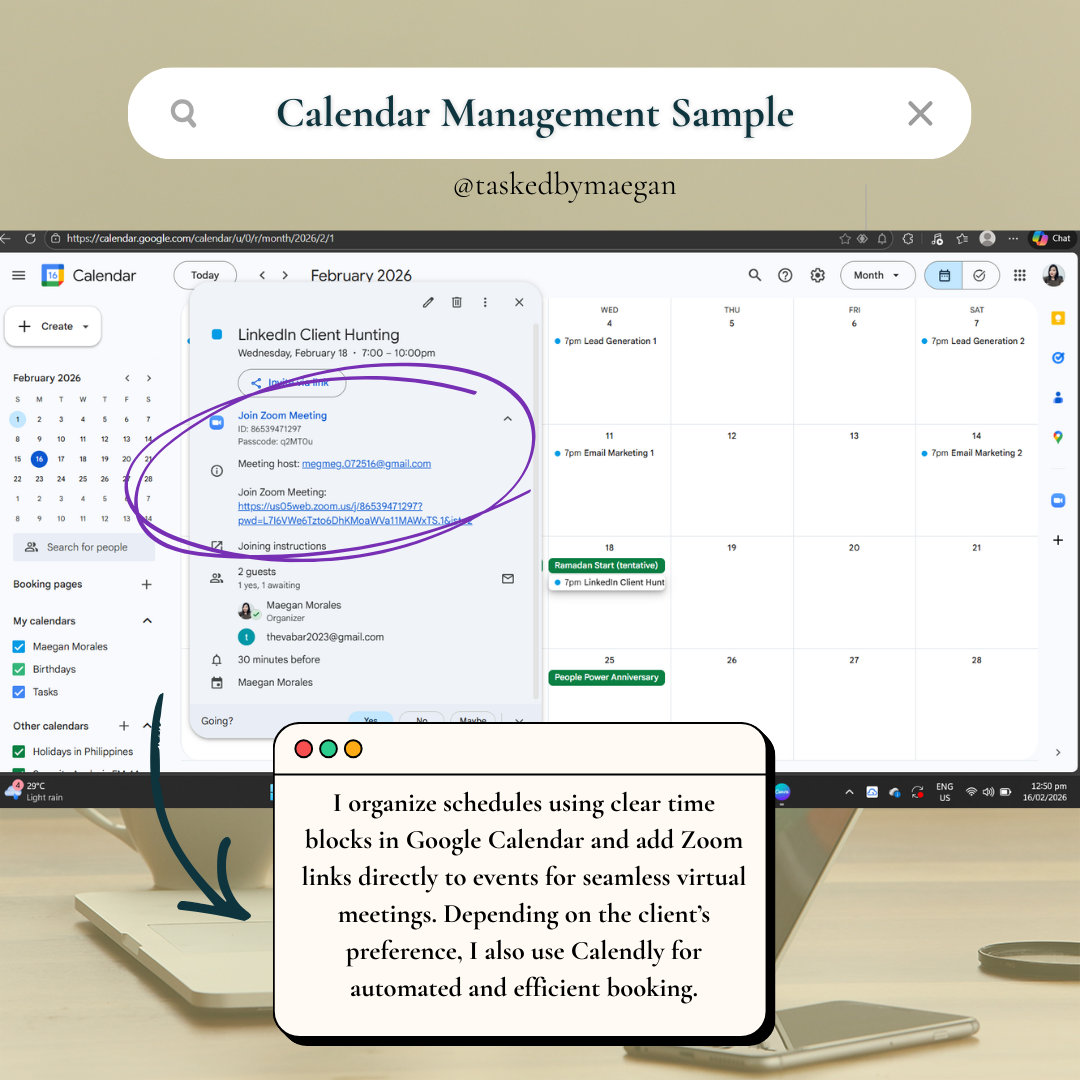 I value clear communication, accuracy, and efficiency in every task I handle. I make sure calendars are organized, social media content is posted consistently, and email marketing tasks are properly managed. I work with focus and attention to detail because I believe small tasks, when done right, create big results.