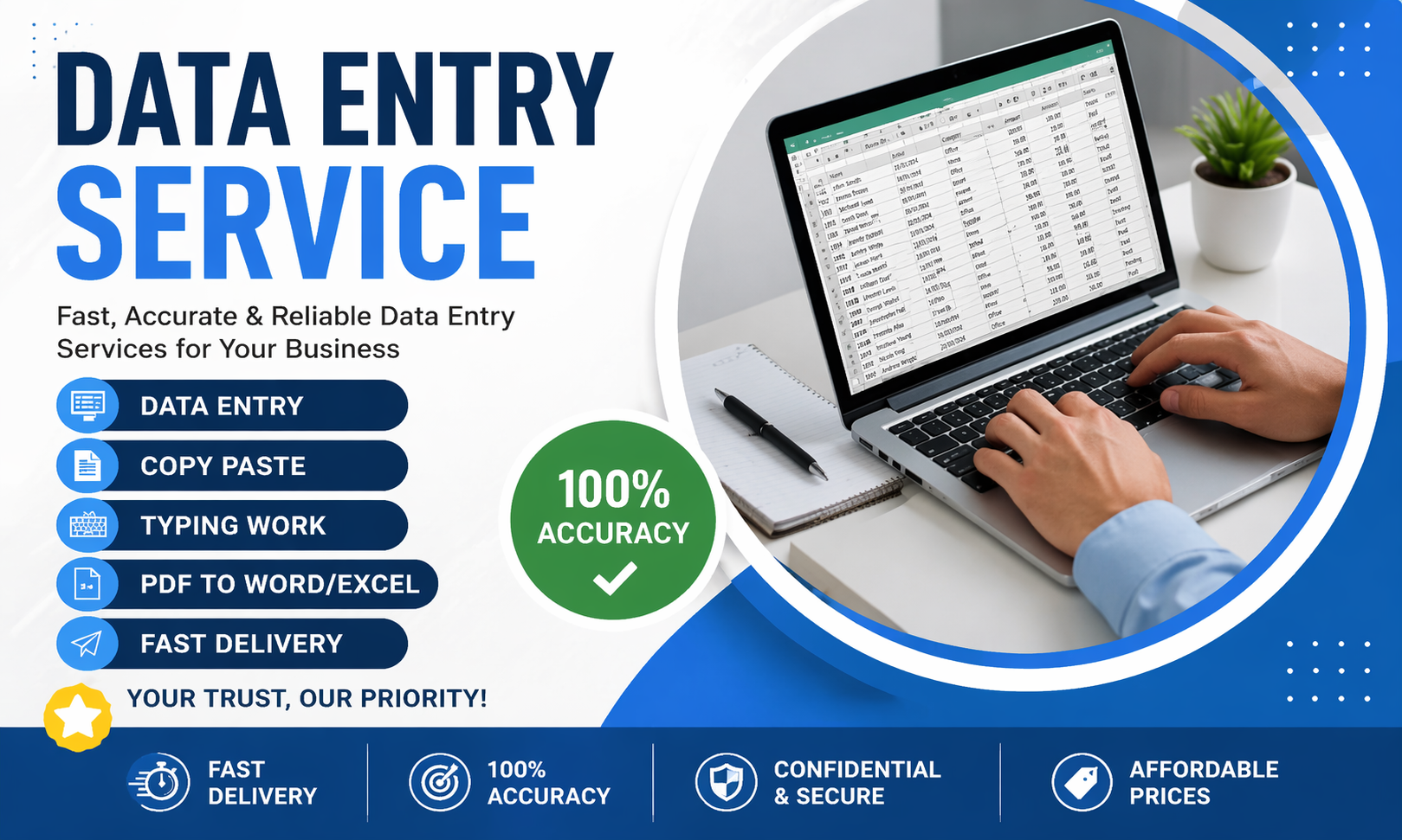 I offer data entry, copy paste, typing, Excel and Google Sheets work with high accuracy and fast delivery.