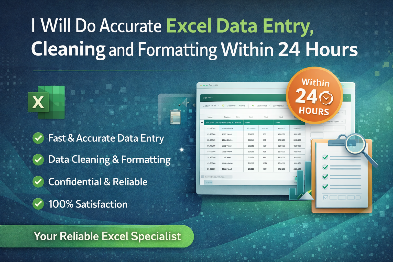 I specialize in professional data entry, Excel formatting, and data cleaning services designed to save your time and keep your information organized. Whether you have raw data that needs to be structured, large spreadsheets that require formatting, or documents that need conversion into Excel, I am here to help.