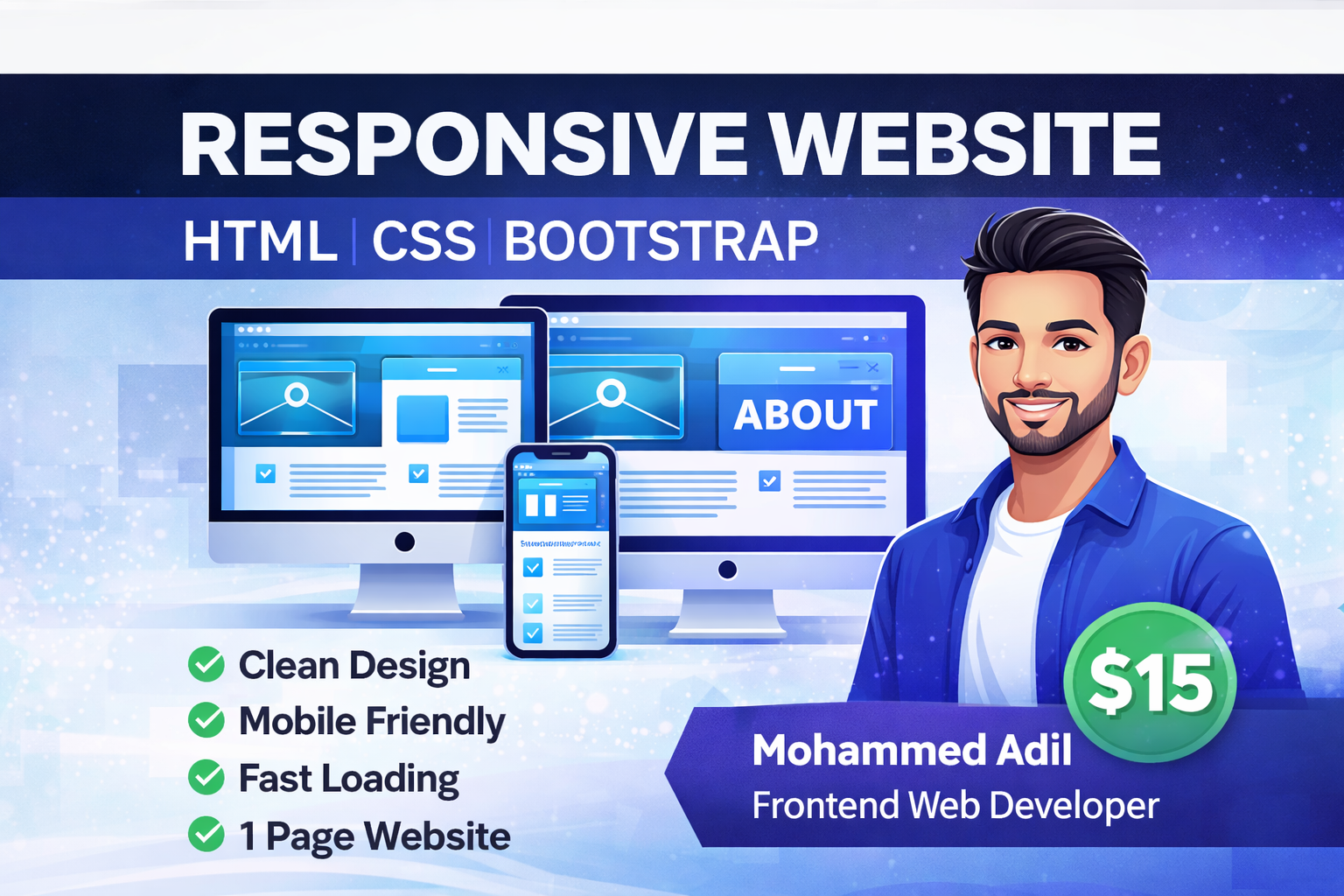 Hi I am Mohammed Adil a Frontend Web Developer from India. I specialize in building clean responsive and user friendly websites using HTML CSS JavaScript and Bootstrap. I can create Responsive websites Landing pages Portfolio websites Website redesign Bug fixing I always focus on quality work and client satisfaction.
