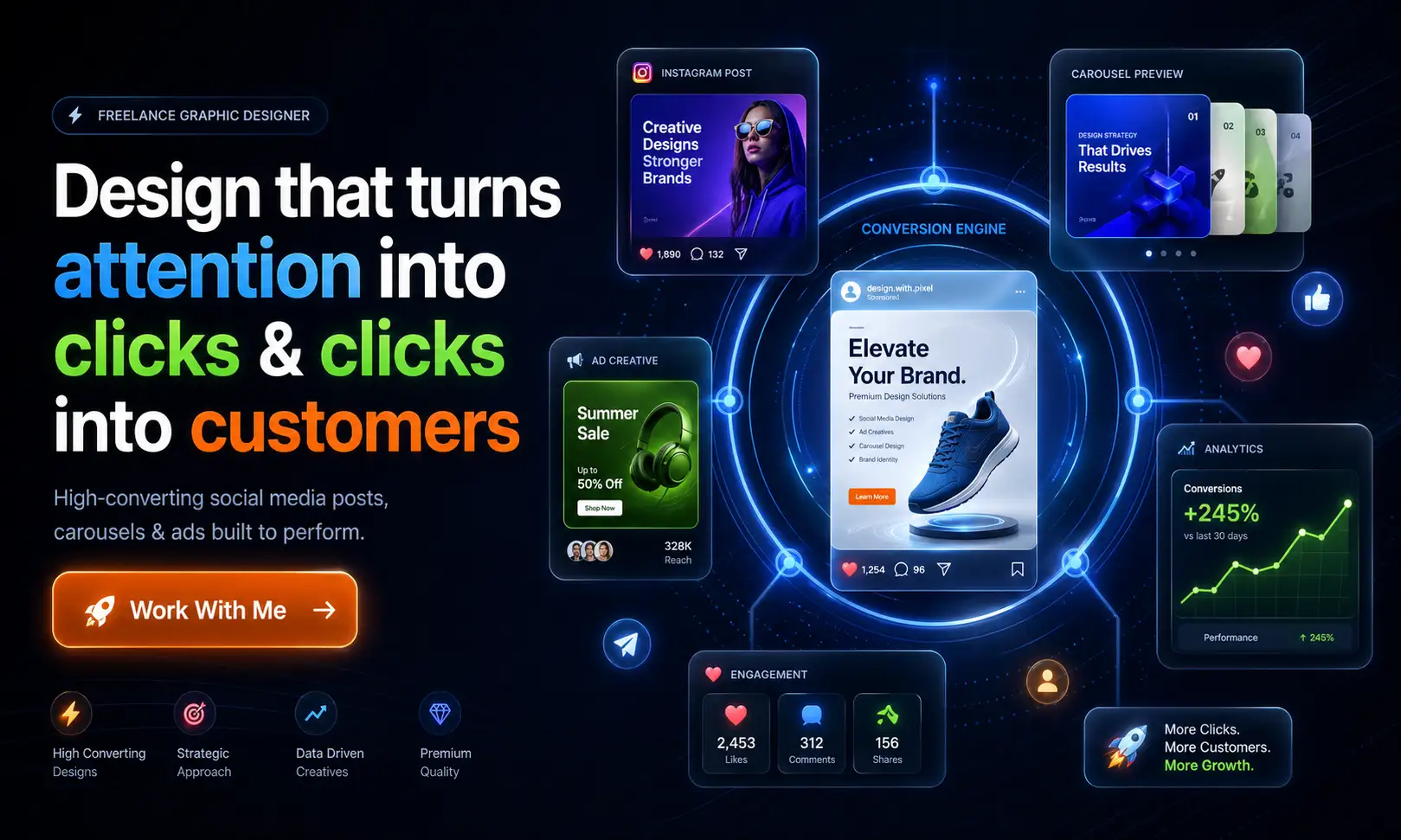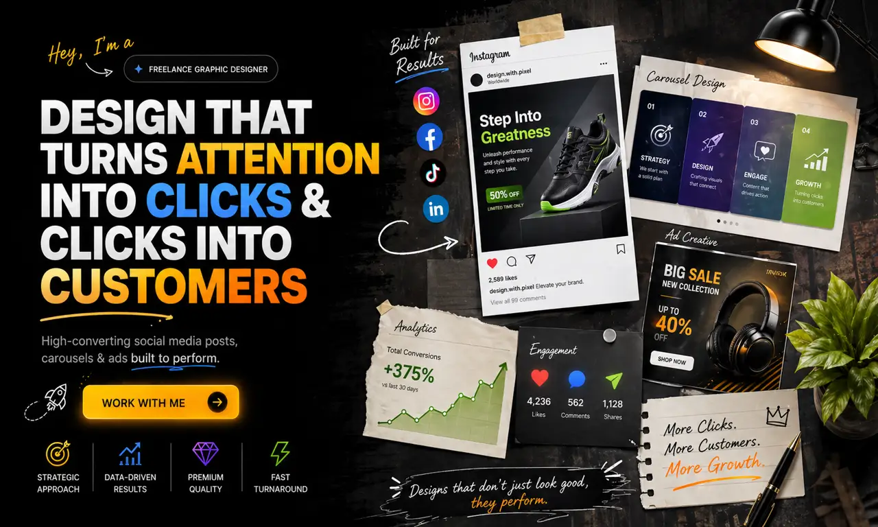 Hi, I’m a freelance graphic designer who creates modern and clean designs for social media, logos, and branding. I use tools like Photoshop, Illustrator, and Canva to deliver creative designs that fit your brand and attract your audience. I believe in quality work, quick turnaround times, and friendly, professional communication.