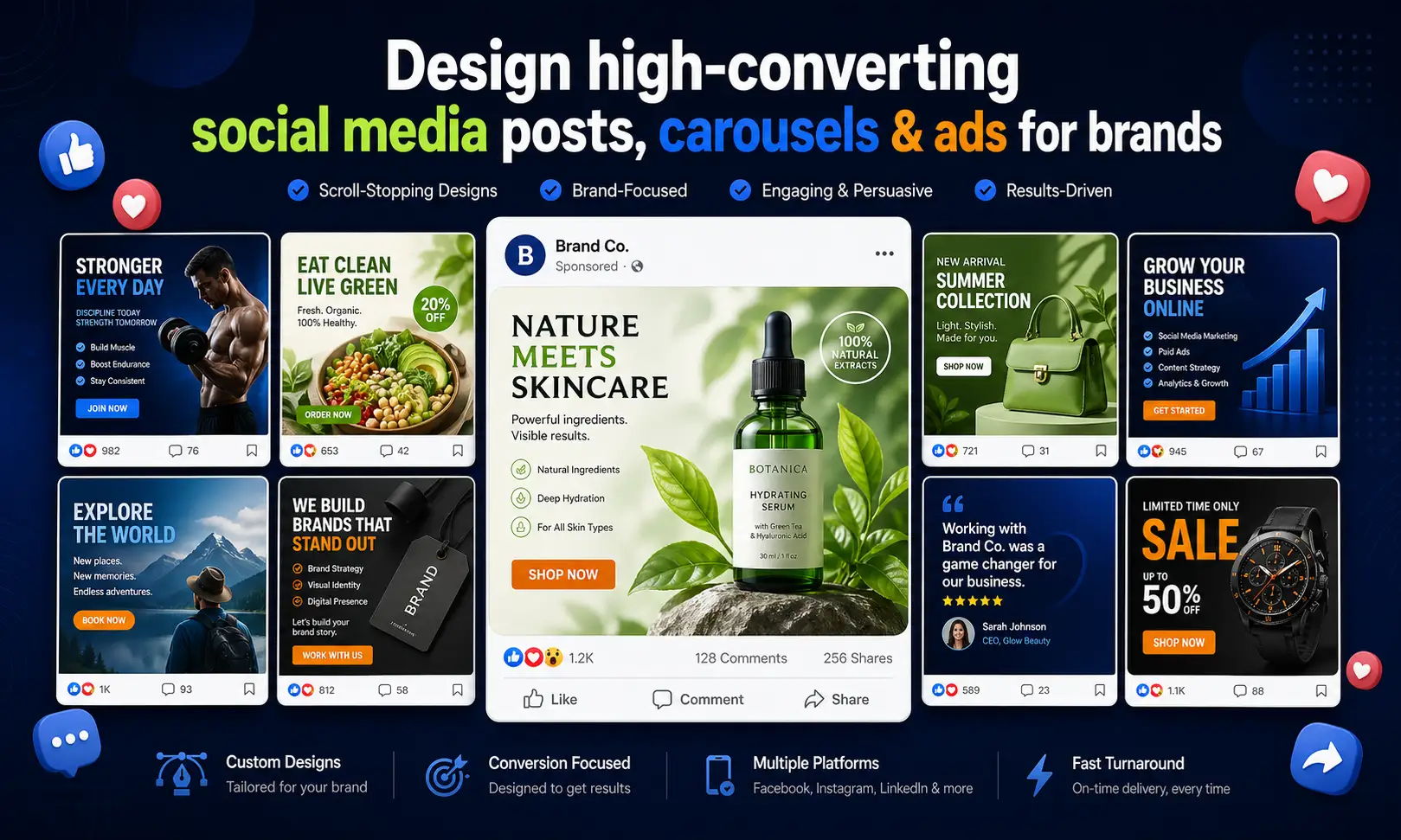 If you have a specific style, reference, or campaign in mind, please share it when ordering. I will align the designs with your vision and make sure the posts are consistent with your brand.