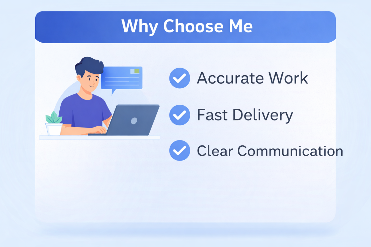 I provide reliable and professional freelance services tailored to meet your specific needs and expectations. My main goal is to help clients save time, reduce workload, and achieve accurate results through high-quality work and clear communication.