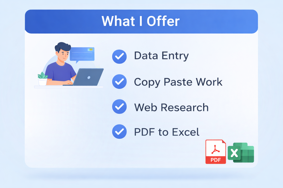 I provide data entry, copy paste tasks, web research, Excel and PDF to Word work.