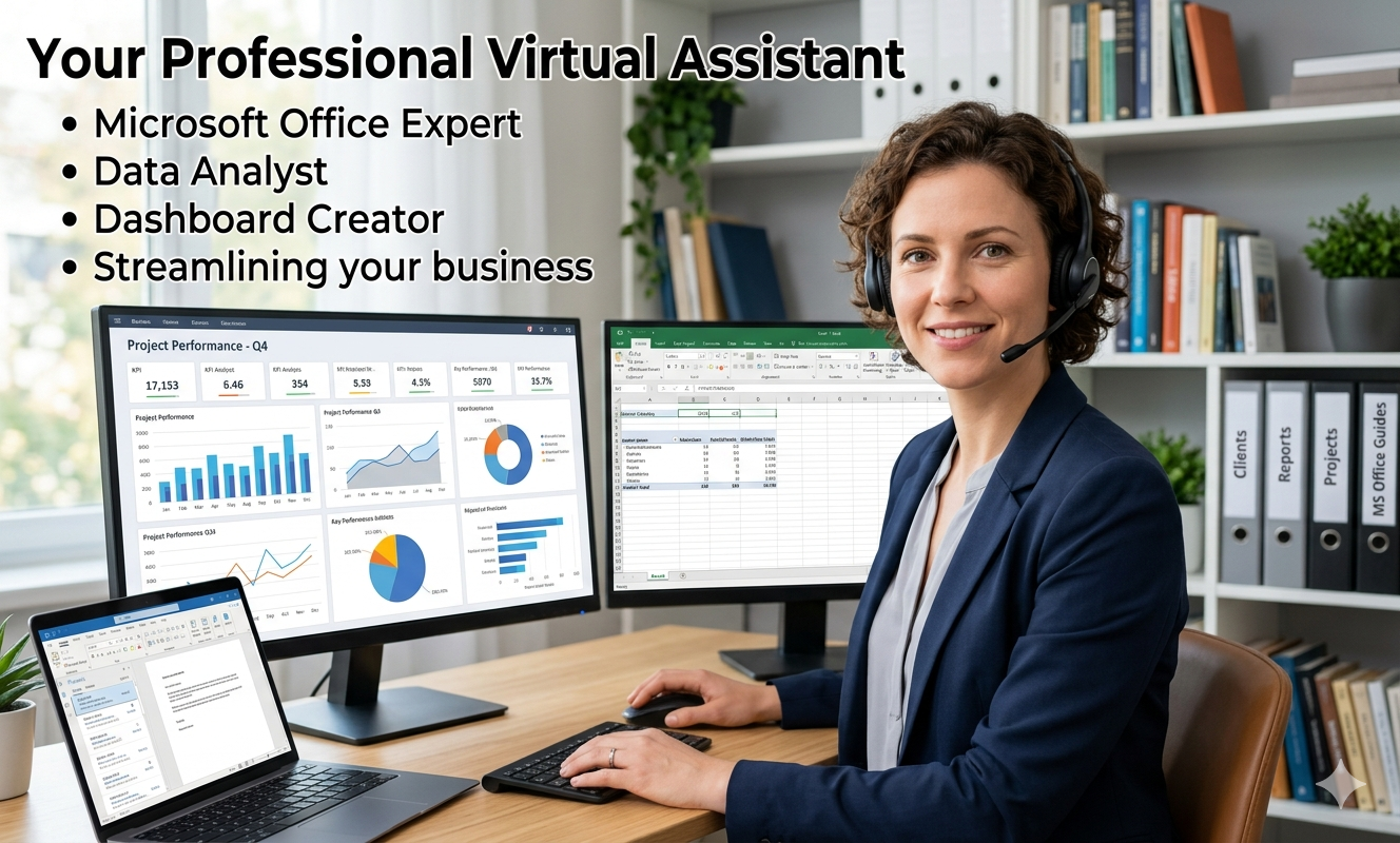 I provide virtual assistant services including MS Office work, Excel dashboard creation, data analysis, data entry, reporting, and administrative support tasks.