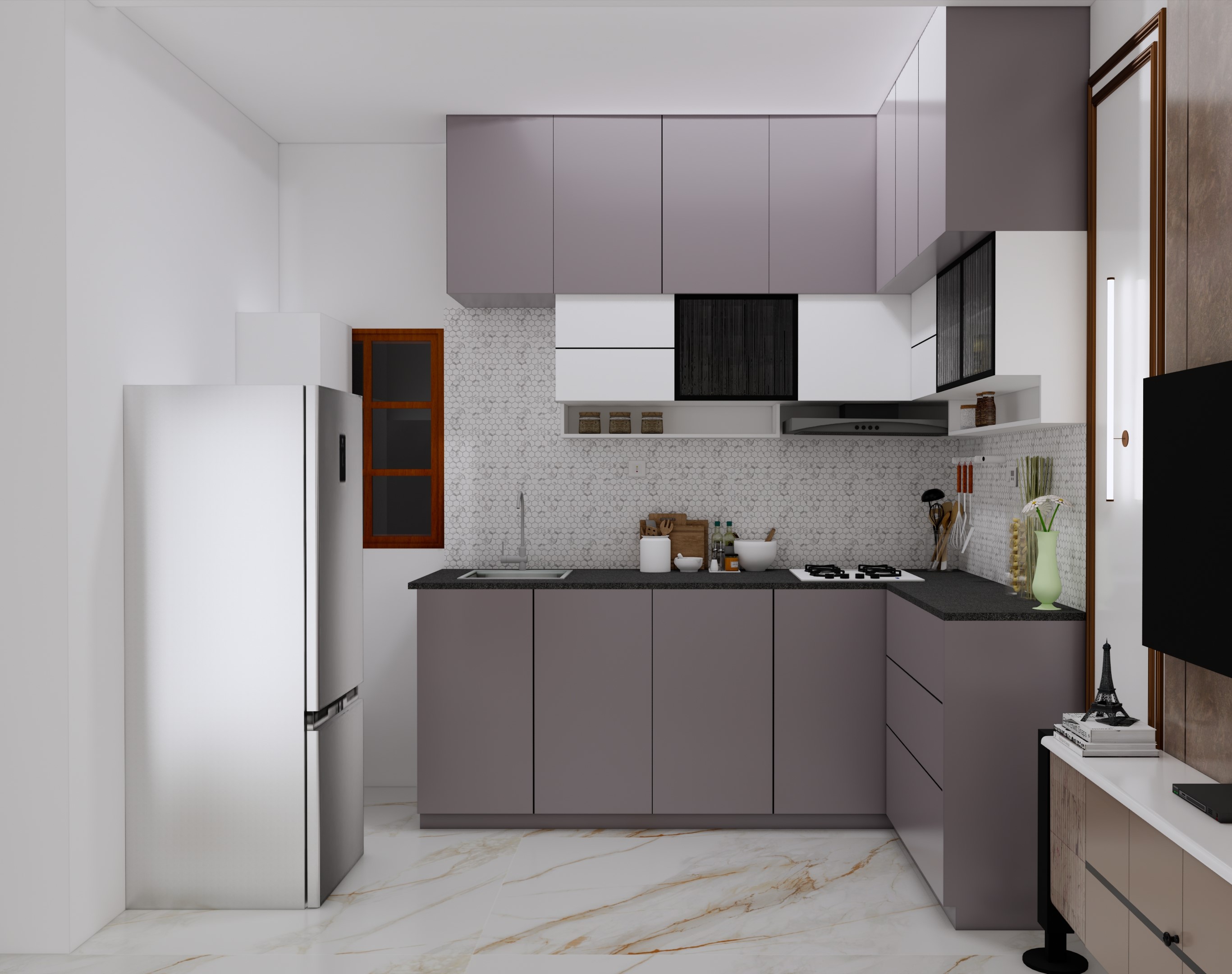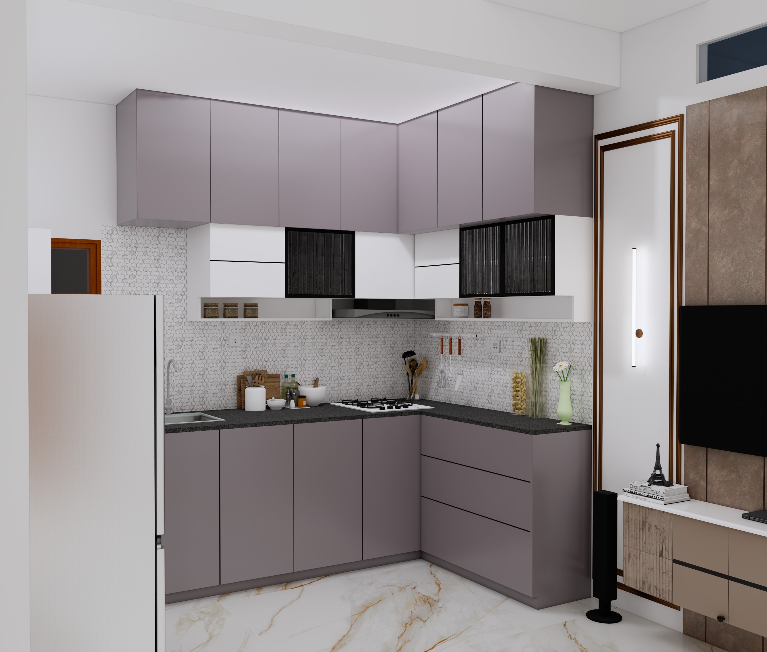 Simple 3D view of TV unit or kitchen with 1 times revisions are provided.