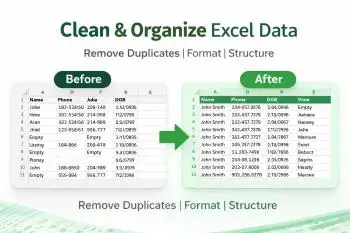 I clean and organize raw data into accurate, structured, and analysis-ready formats. Using Advanced Excel and SQL, I remove duplicatesw, fix inconsistences, standardize formatting, and prepare reliable datasets for reporting and business decisions. I work with Excel, CSV files, and database exports to ensure clean, usable, and professional results.