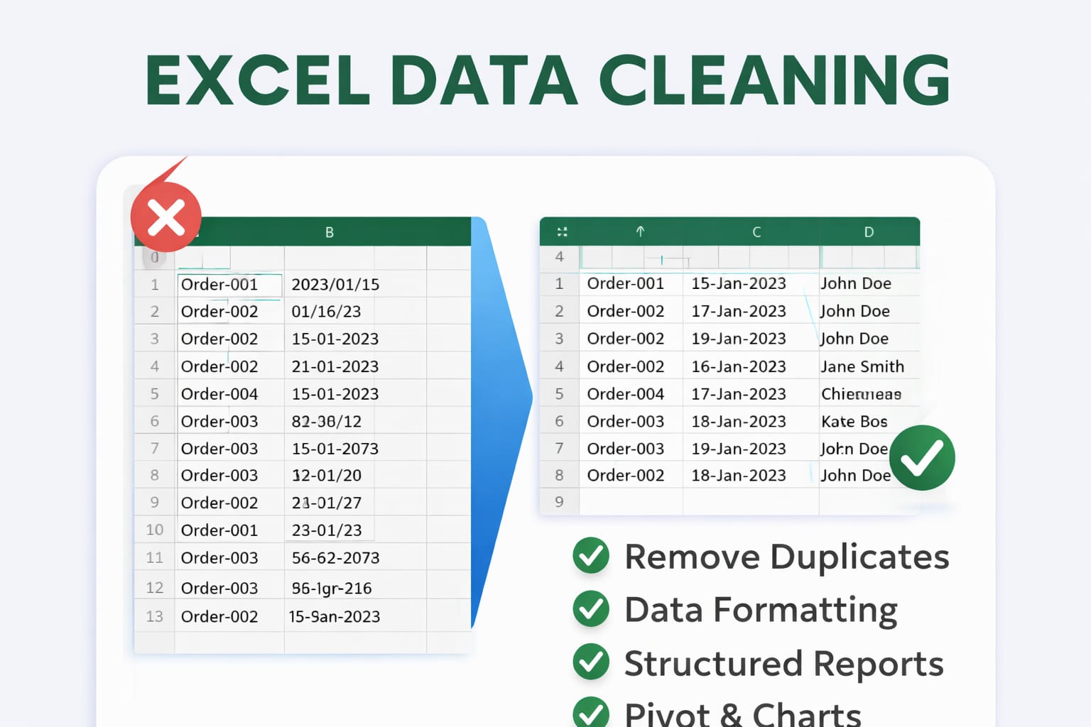 Many datasets contain duplicates, formatting issues, incorrect values, missing data, and inconsistent structures. I systematically identify and resolve these issues to ensure your data is accurate, standardized, and professionally organized.
