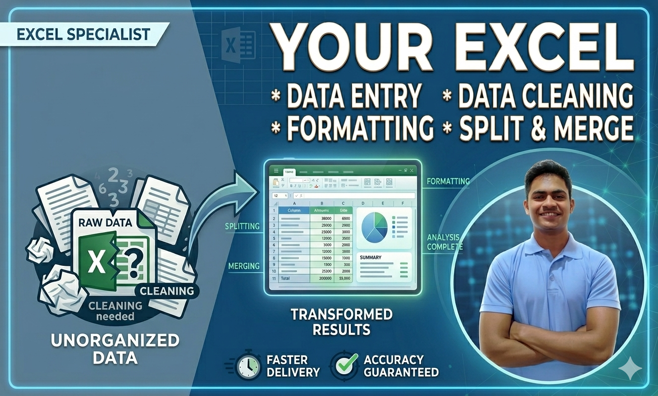 I am a Excel Expert with 6 months of work experience in data cleaning, formatting, merging, and splitting services tailored to your goals. I specialize in removing duplicates, correcting errors, and structuring data for seamless analysis. Precision: High-quality, error-free results. Speed: Reliable, on-time delivery. Support: Clear communication and post-delivery revisions.