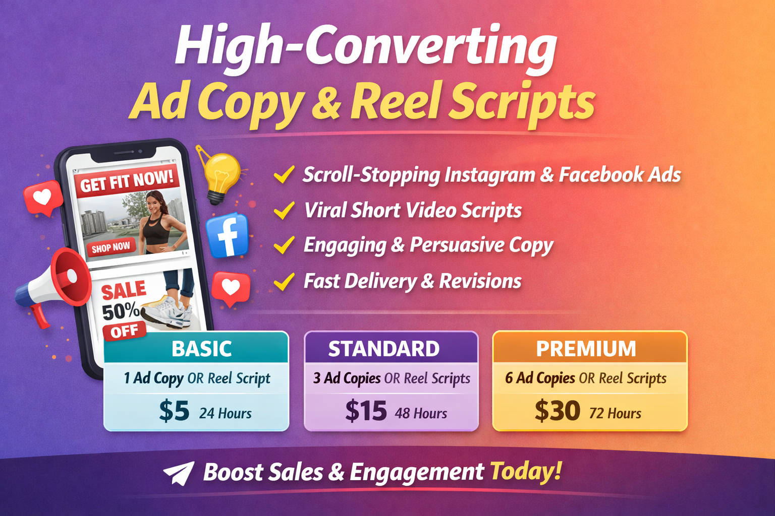 I provide high-converting ad copy and short reel scripts designed to help brands, coaches, and online businesses grab attention and increase sales. Whether you need scroll-stopping Instagram captions, engaging Facebook ads, or viral short-form reel scripts, I create content that connects with your audience and drives results. My copy is written in clear English, easy to read, and optimized to persuade people to take action.