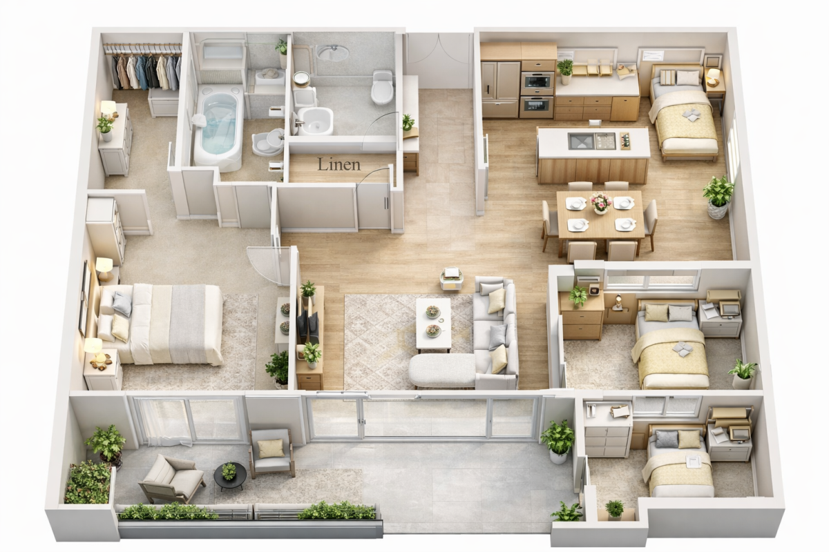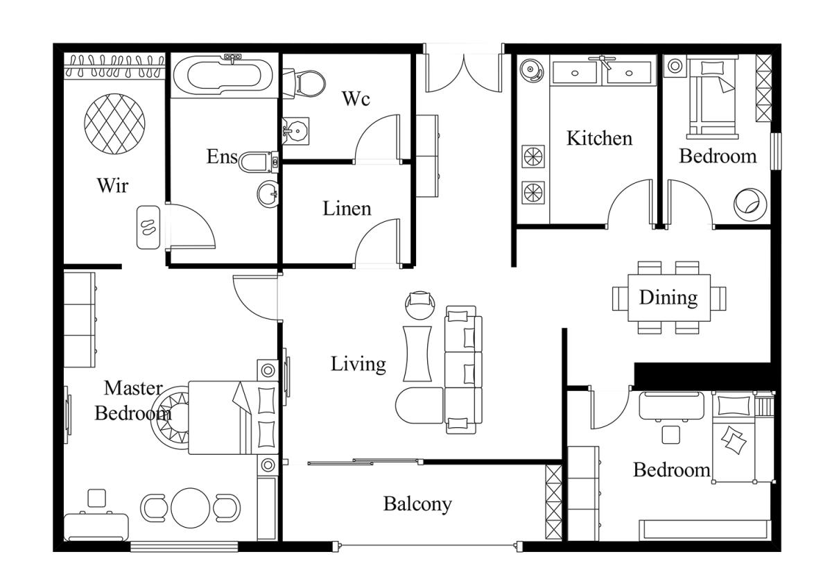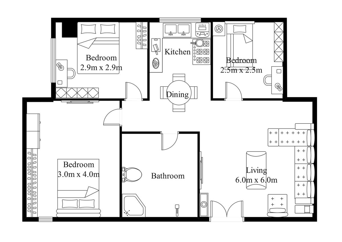 Professional B&W 2D floor plan redraw from sketches. High-resolution output.