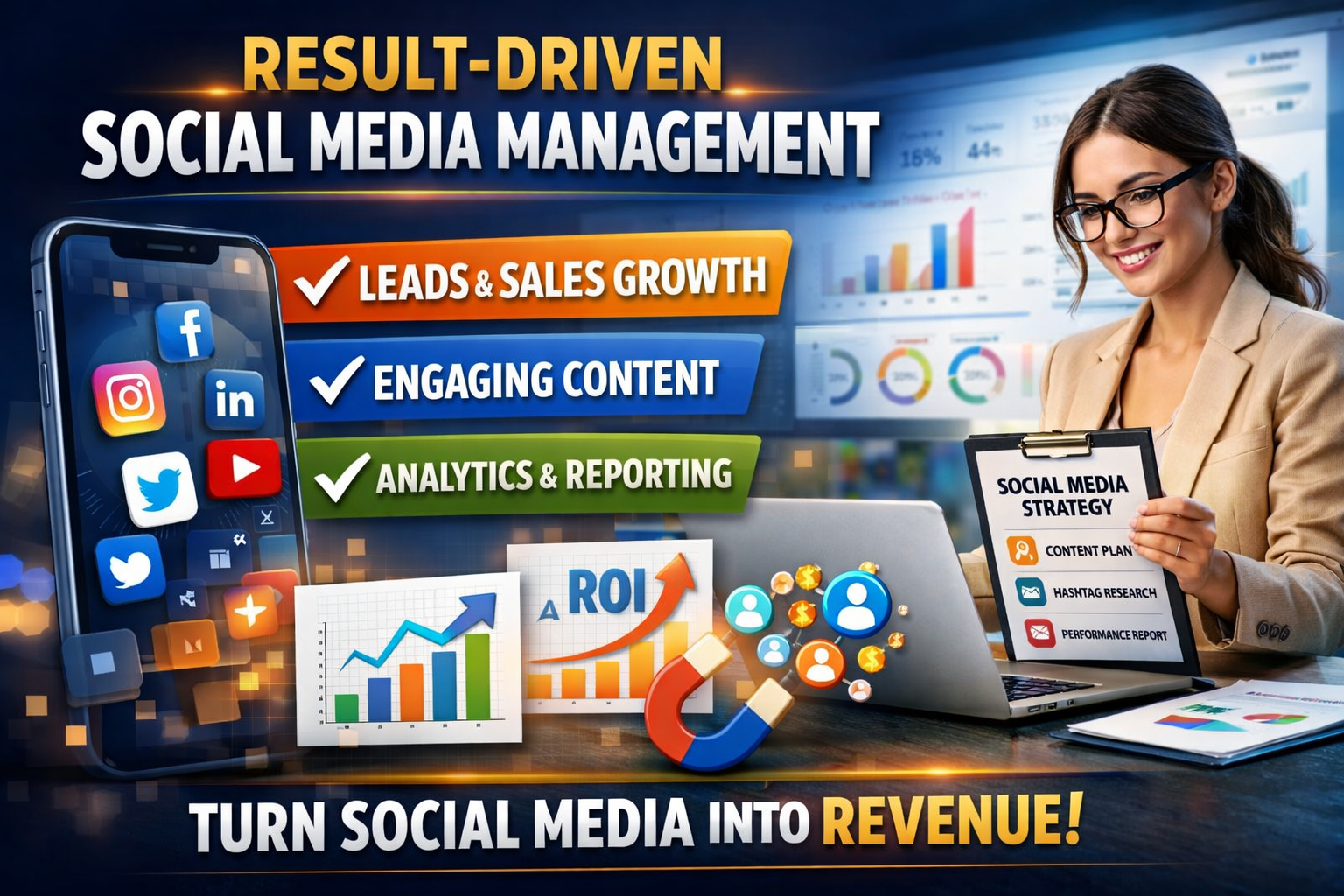 I will provide ROI-focused social media management designed to generate qualified leads, increase brand visibility, and drive measurable business growth. My approach is strategic, data-driven, and aligned with your revenue goals—not just vanity metrics like likes and followers.