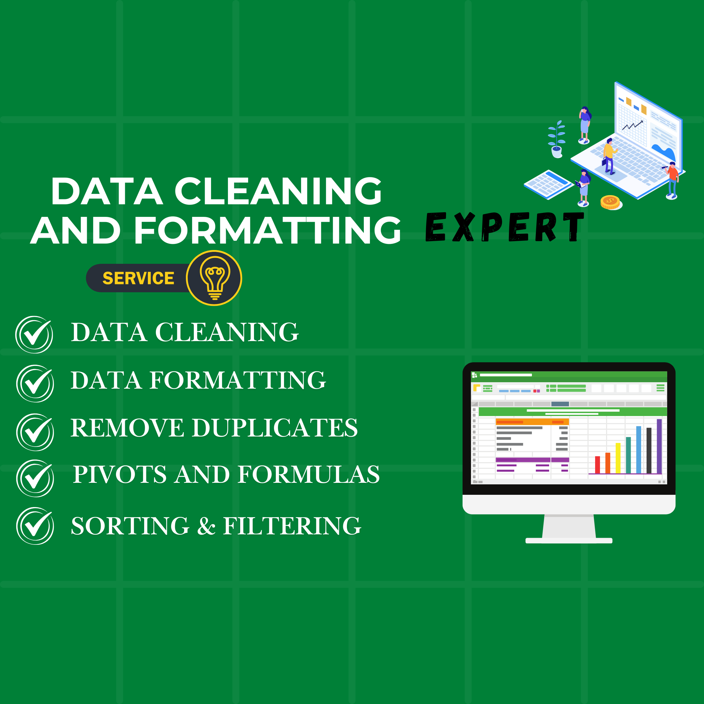 Do you have messy, unorganized, incomplete, or duplicate data in Excel or Google Sheets? I will clean, format, and structure your data professionally to make it accurate, consistent, and easy to use. Poorly organized data can lead to errors, confusion, and wasted time. My goal is to transform your spreadsheet into a clear, reliable, and well-structured file that supports better decision-making and smooth workflow.