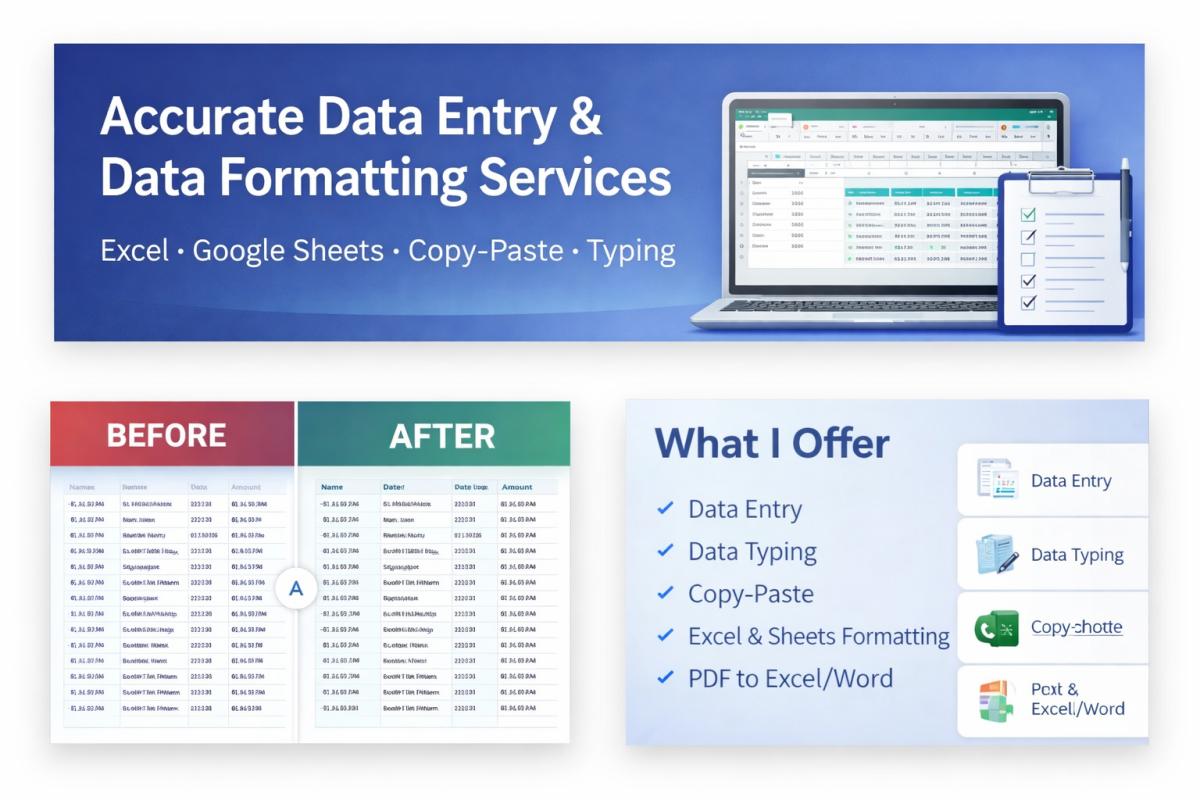 I am a detail-oriented Data Entry professional focused on accuracy, confidentiality, and timely delivery. I have experience handling data entry, data cleaning, copy-paste tasks, PDF to Excel/Word conversion, and web research. I work efficiently with MS Excel and Google Sheets, follow instructions carefully, and always double-check my work. My goal is to provide clean, organized, and reliable data that helps clients save time and work smoothly.
