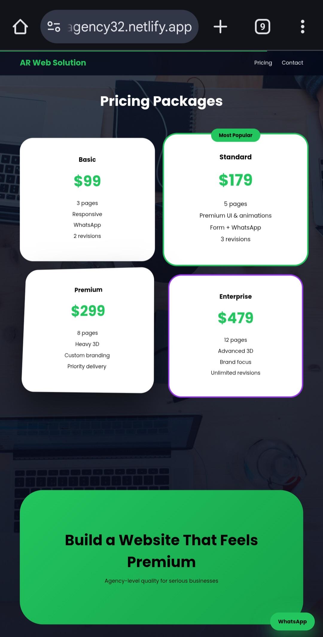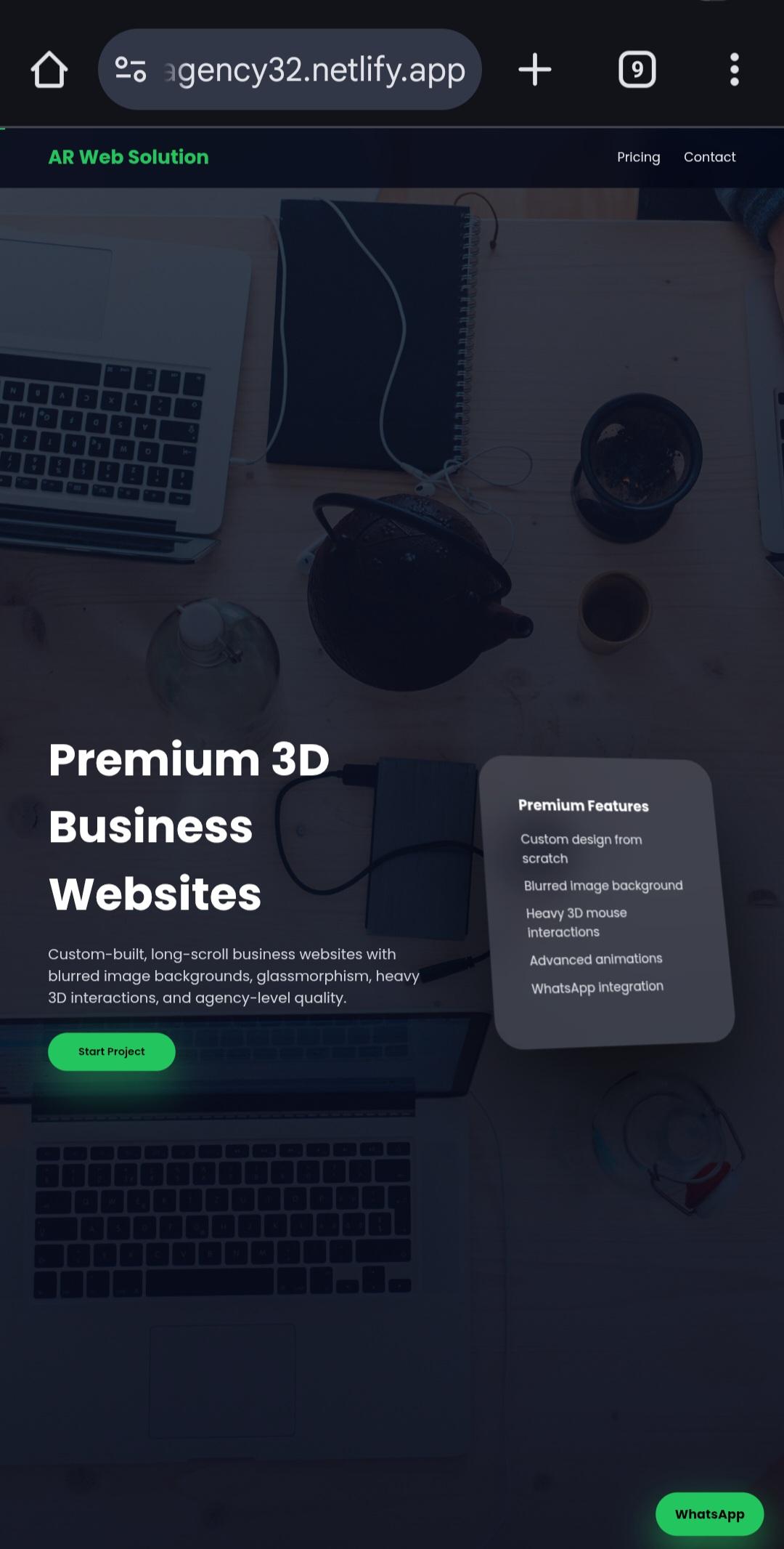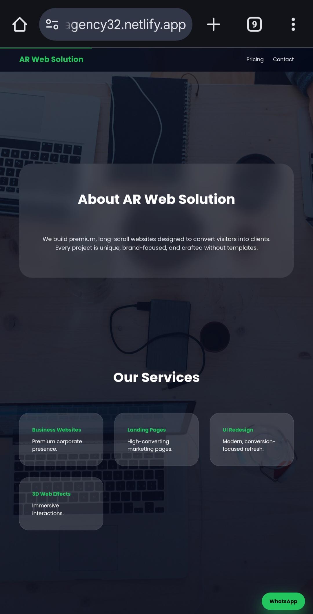 Your business website can include sections such as hero section, about us, services, pricing, contact form, and WhatsApp integration for direct customer communication. I make sure the website looks premium and stands out from common templates.