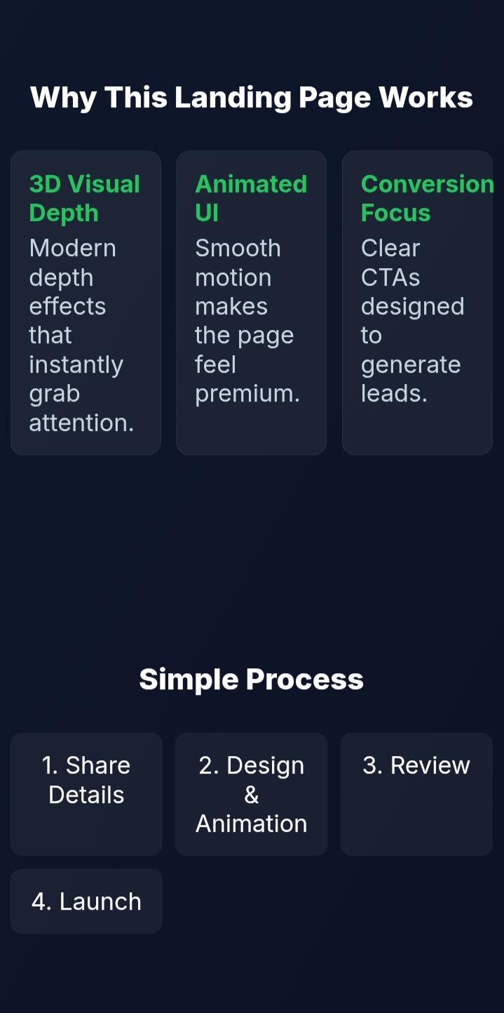 This service includes a fully responsive landing page that looks perfect on mobile, tablet, and desktop devices. I ensure fast loading speed, clean HTML & CSS code, and an easy-to-navigate structure that keeps visitors engaged. Whether you need a landing page for a business, service, product, startup, or personal brand — I can help.