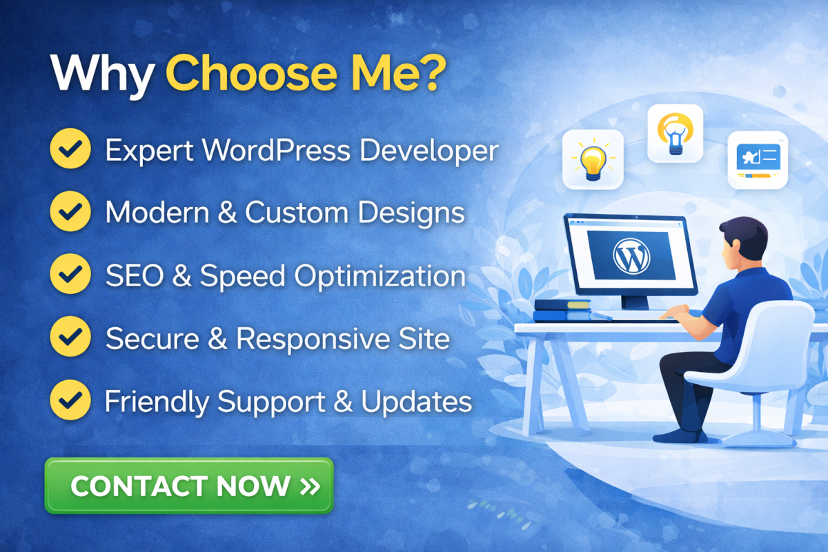 I am a WordPress developer with hands-on experience in building clean, fast, and user-friendly websites for businesses, startups, and individuals. I focus on design quality, performance, and ease of use, so you get a website that not only looks great but also works smoothly.