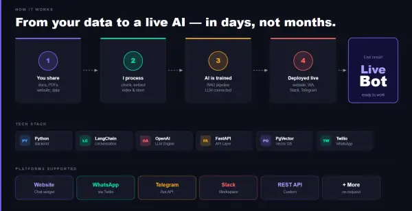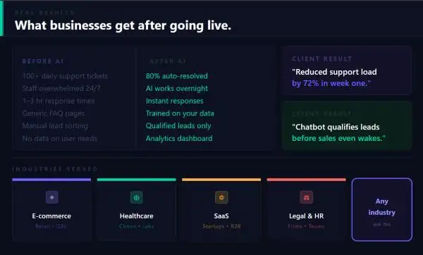 This service is ideal for businesses looking to automate customer support, improve response time, and reduce manual workload. It can also be used as an internal assistant to help teams quickly access information or as a sales support tool to engage and qualify leads.