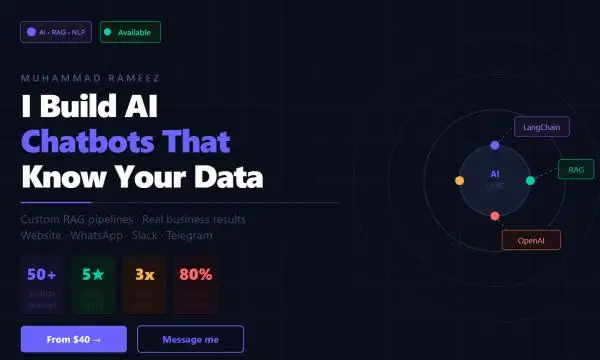 I’m an AI Engineer specializing in custom chatbots, RAG systems, and business automation. I help companies turn their data into smart AI solutions that improve customer support, generate leads, and reduce manual work. From idea to deployment, I build reliable systems that deliver real results.
