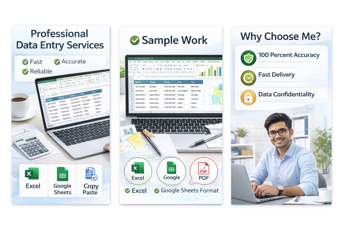 My data entry services include online and offline data entry, copy-paste tasks, typing work, Excel and Google Sheets data entry, PDF to Word or Excel conversion, web research, and data collection. I can efficiently manage large volumes of data while maintaining proper formatting and organization.
