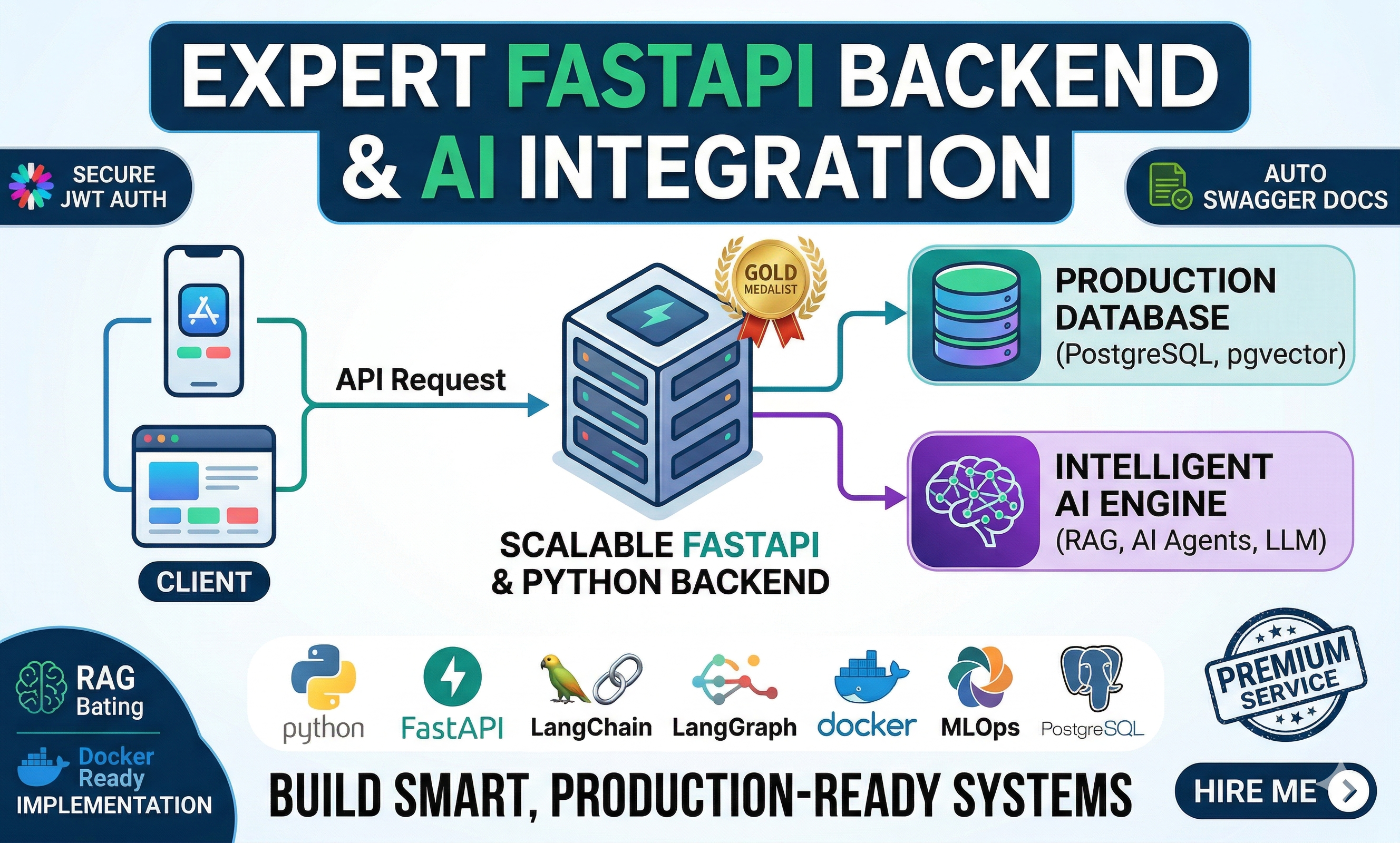 AI Gold Medalist specializing in production-ready AI apps and high-performance REST APIs. I architect scalable systems where ML meets backend efficiency. AI/ML: RAG, LangChain/LangGraph, MLOps, Computer Vision. Backend: Python, FastAPI, Pydantic, PostgreSQL. Full-Stack: React 18, TypeScript, Tailwind. I handle the full lifecycle from model optimization to responsive frontends—delivering clean, industry-standard code.