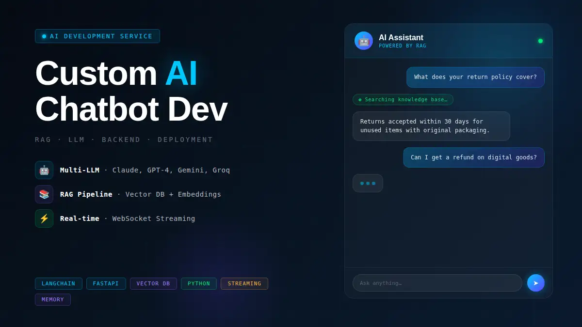 I provide end-to-end development of custom AI chatbots designed for production environments. Unlike basic scripts, I build scalable systems using industry-standard tools such as FastAPI, LangChain, and PostgreSQL with pgvector.
