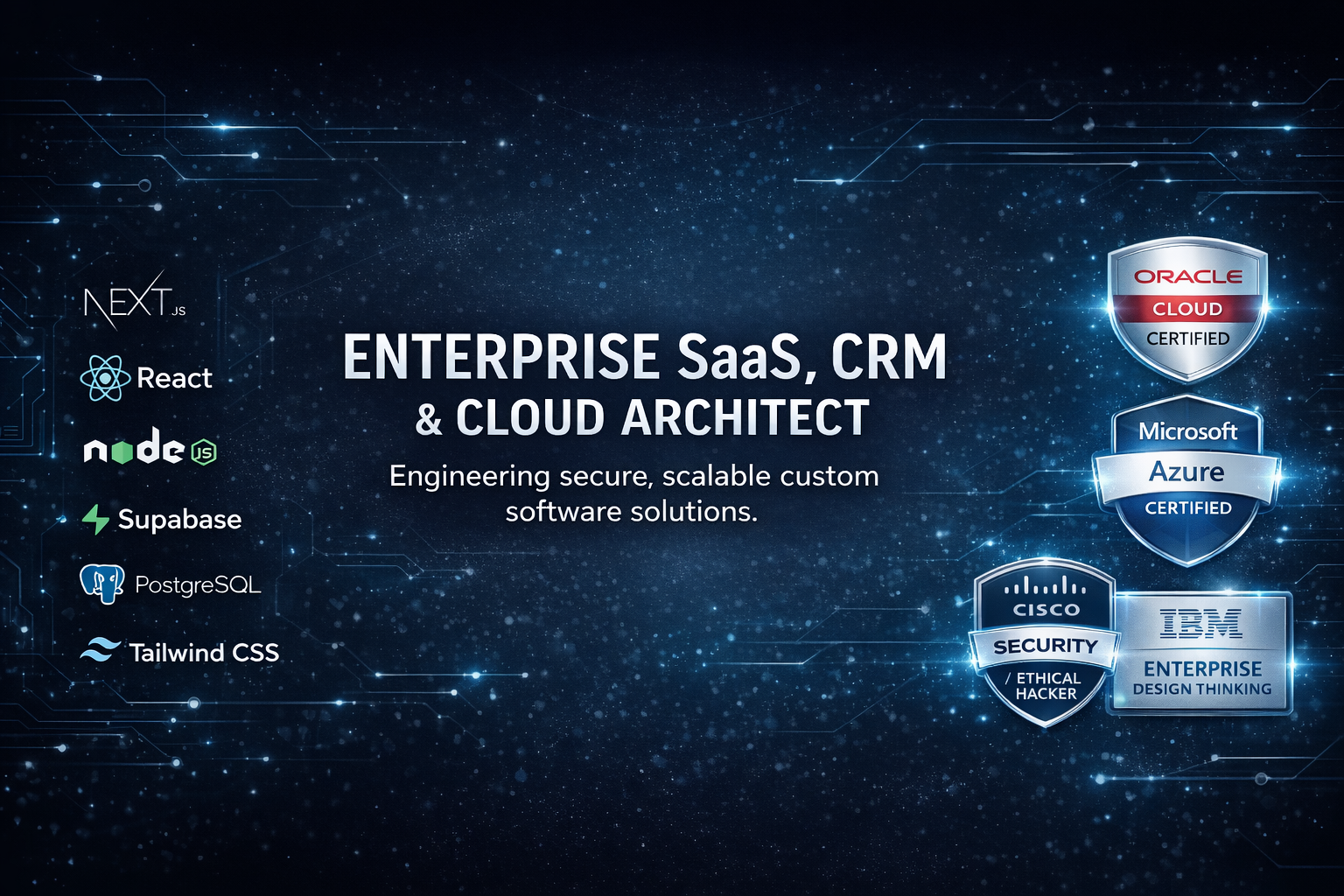 I engineer scalable business solutions, not just basic websites. As a Full-Stack Architect, I build high-performance SaaS platforms, custom CRMs, and robust ERP systems to automate your workflows. Tech Stack: NextJS, React, Supabase, NodeJS. Backed by official certifications from Oracle (Cloud), Microsoft (Azure), Cisco (Security), and IBM (Enterprise Design Thinking), I guarantee secure, enterprise-grade architecture. Let's build exactly what your business needs.