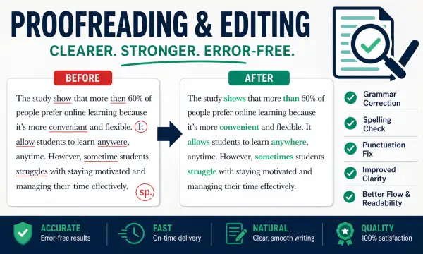 I provide careful proofreading and editing services to make your text clear natural and error free, I correct grammar spelling and punctuation while also improving clarity structure and overall readability so your writing sounds polished and professional. Every text is reviewed in detail to ensure it is easy to understand and flows naturally, I keep your original meaning and tone while improving sentence structure consistency and overall quality. Delivered with accuracy attention and professional quality every single time.