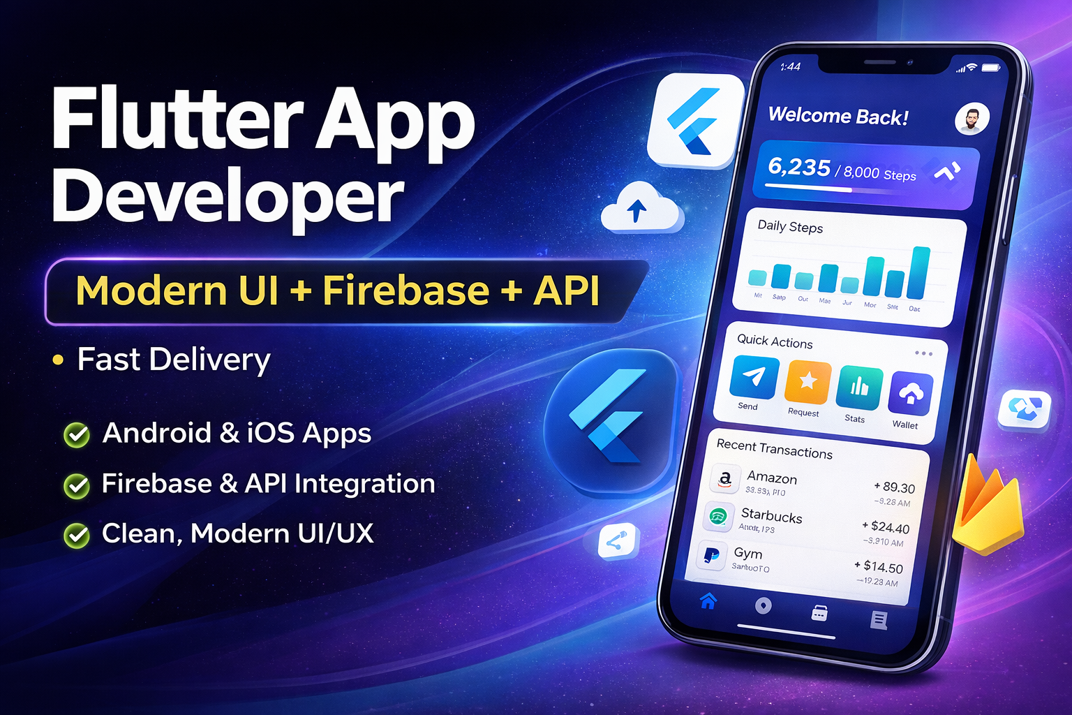 I can help you with a wide range of services, including custom Flutter app development tailored to your business needs, Firebase integration for authentication and real-time databases, and seamless API integration to connect your app with external services. I also design attractive and intuitive UI/UX to enhance user engagement and ensure smooth navigation. Additionally, I provide bug fixing, performance optimization, and app improvements to make your application faster and more stable.
