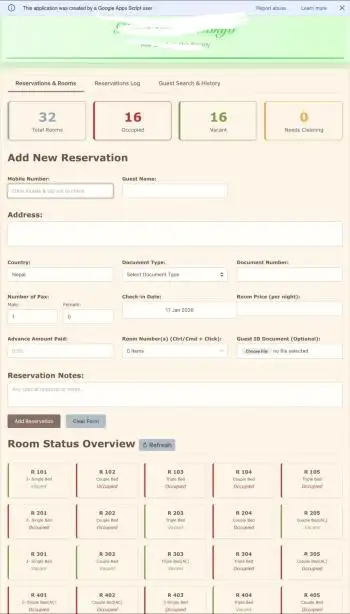 This solution is guaranteed to run for at least two years without any hosting or server cost, ensuring long-term stability and performance. All booking records, guest details, room status, and daily operations are stored securely in Google Sheets, which can be accessed from anywhere with proper authorization.