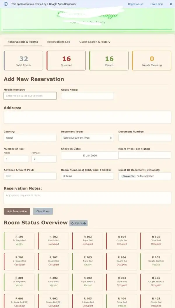 This Hotel Management Software is a complete, cloud-based solution designed to efficiently manage hotels with up to 40 room bookings per day. The system is developed using Google Apps Script as the backend and is hosted directly on Google’s infrastructure, making it highly reliable, secure, and completely cost-free for hosting.