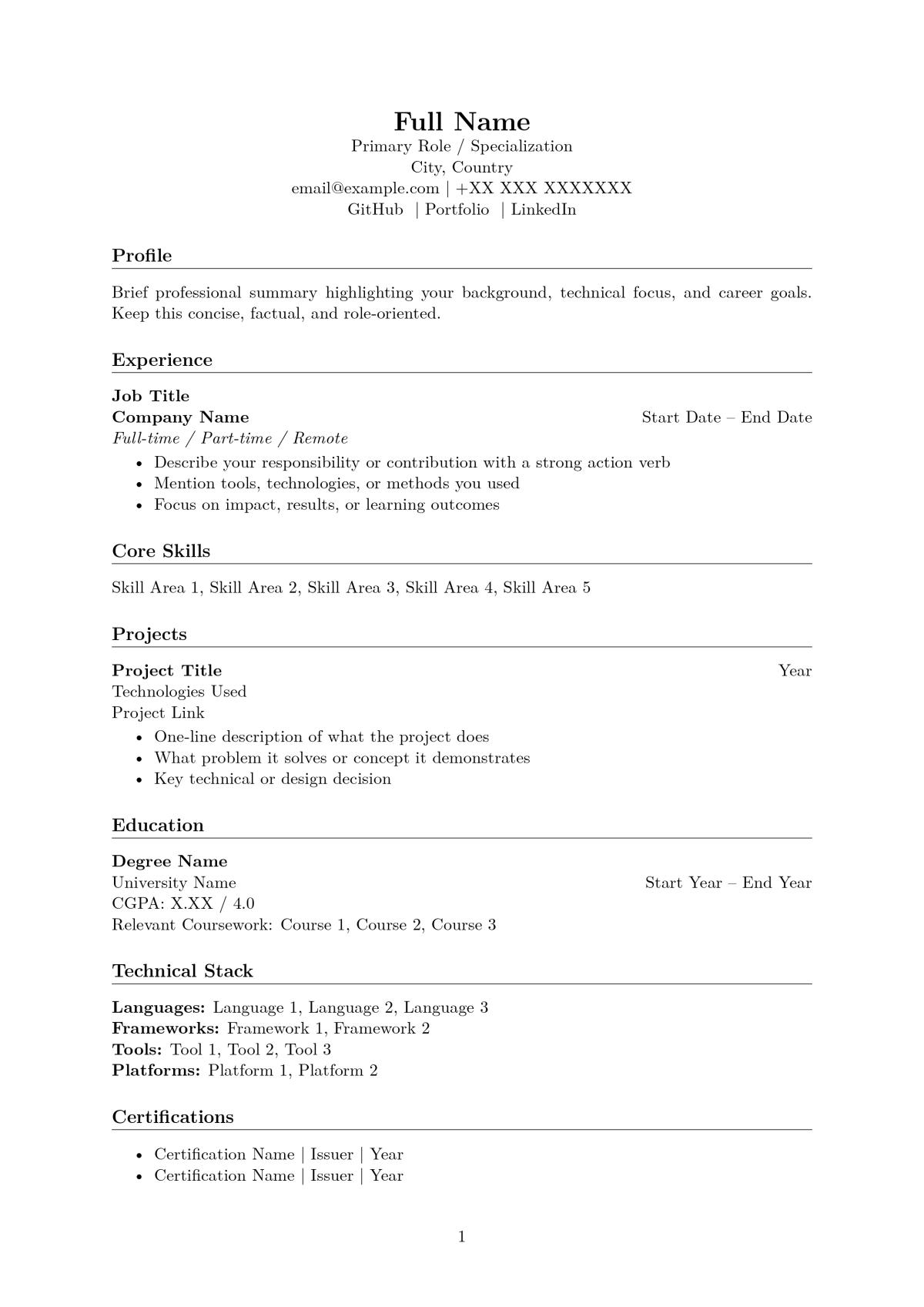 Format your content into a clean, modern LaTeX CV or resume (PDF).