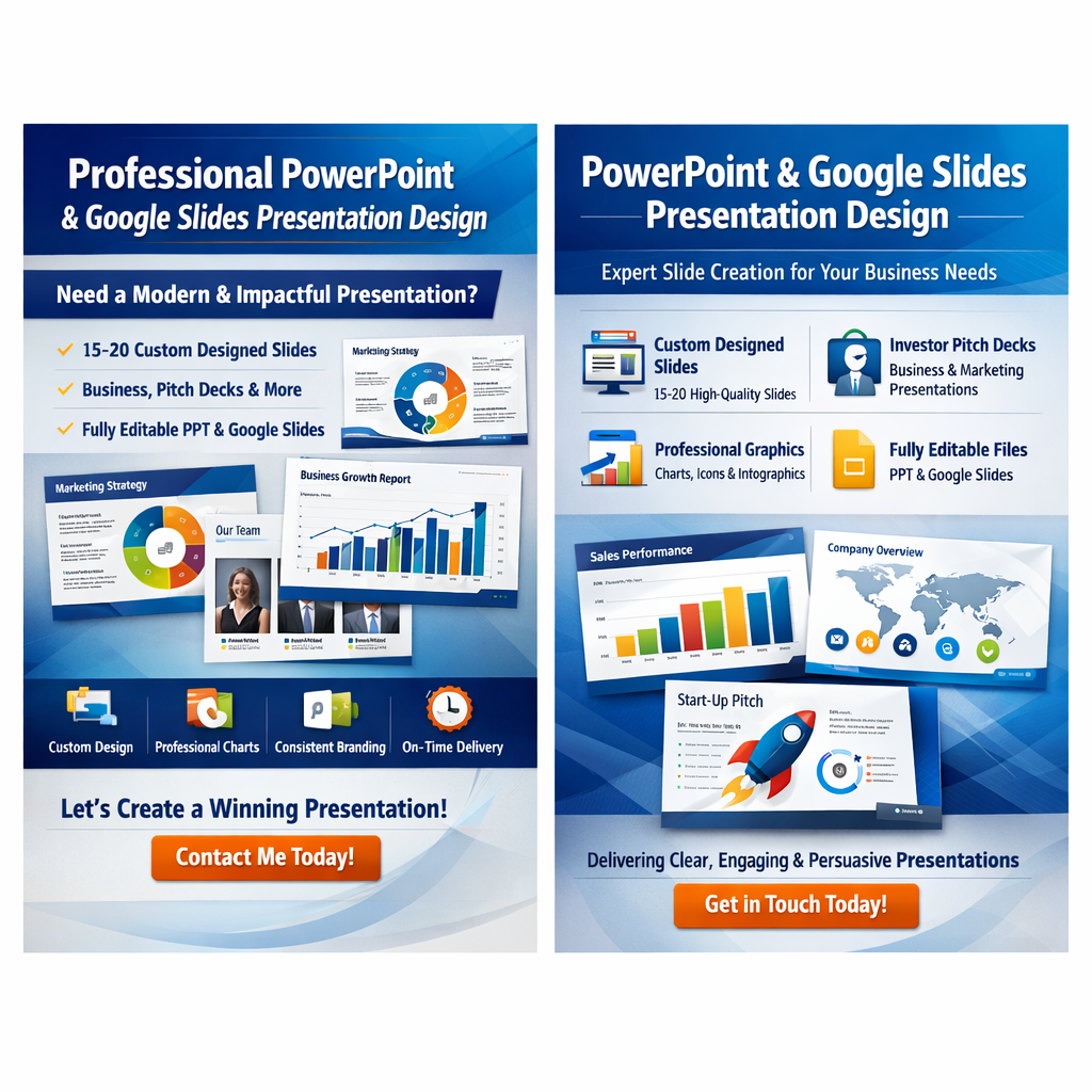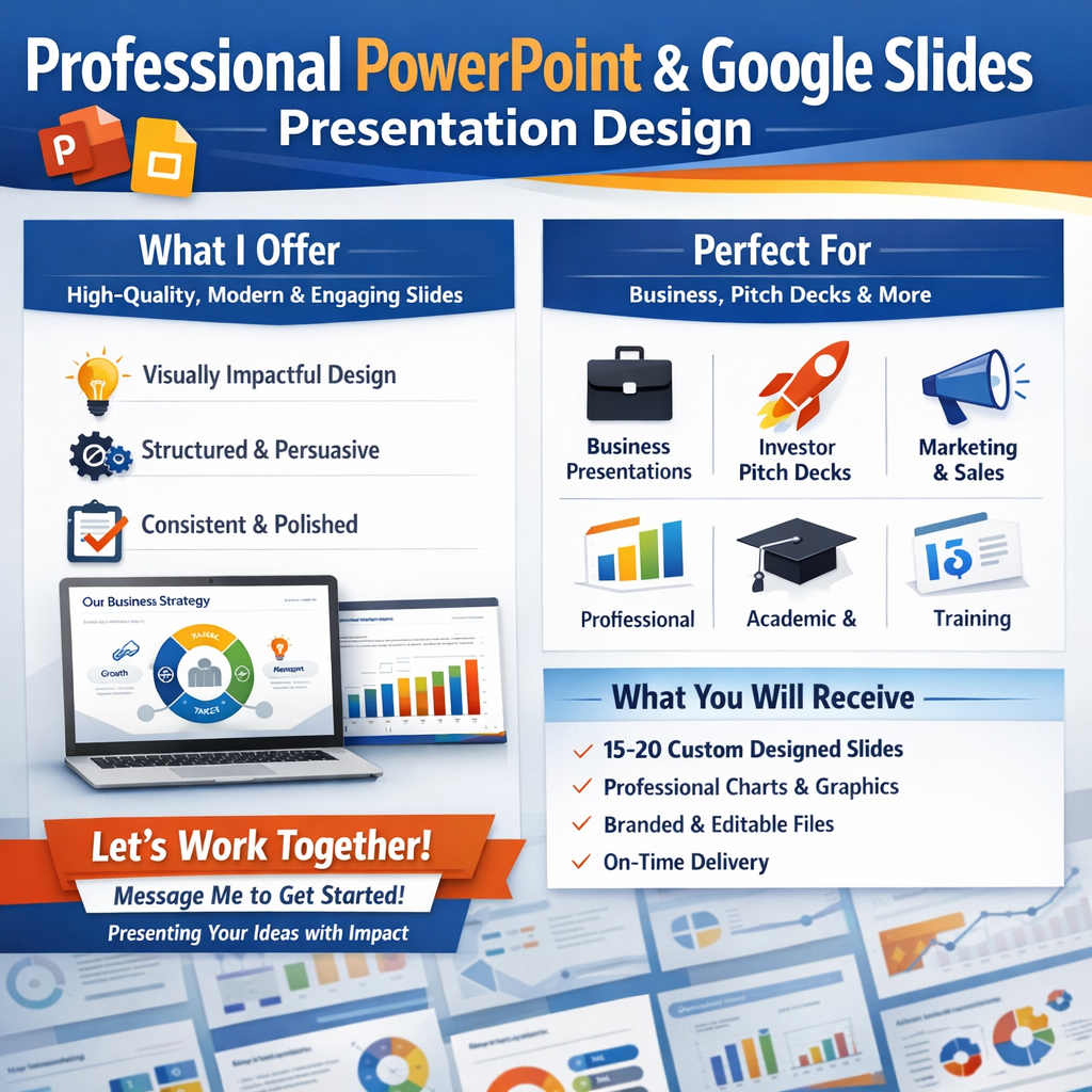 Do you need a modern, clean, and impactful presentation design? I will create a high-quality PowerPoint or Google Slides presentation with 15–20 professionally designed slides based on your content or outline.