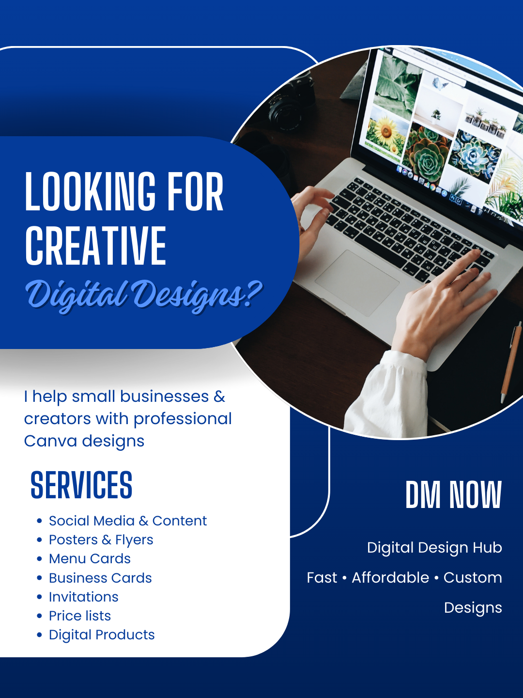What you will get includes social media posts for Instagram and Facebook, flyers and posters, menu design, price list design, and fully custom Canva designs created just for your business. You will also receive an editable Canva link so you can easily update text, colors, or images in the future without any extra cost. I focus on clean layouts, balanced colors, and easy-to-read text so your designs look professional and appealing. I offer fast delivery and friendly communication, and I am always open to revisions to make sure you are fully satisfied with the final result. My goal is to help small businesses and creators grow with attractive, affordable, and high-quality designs. Message me before placing an order so we can discuss your ideas and create designs that truly represent your brand.