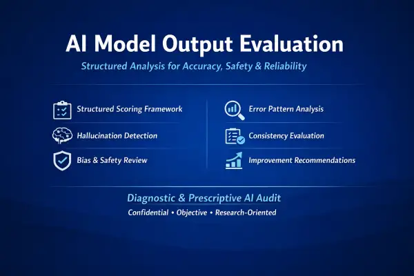 Structured evaluation of AI outputs for accuracy, safety, bias, and reliability.