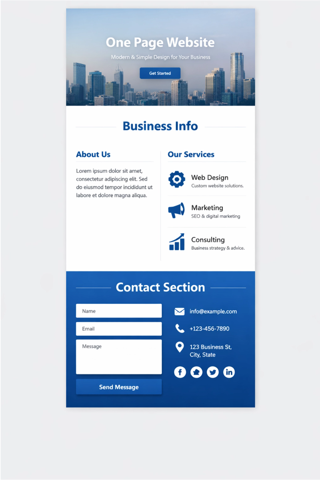 Simple responsive one-page website for small businesses with services and contact details