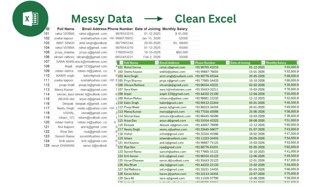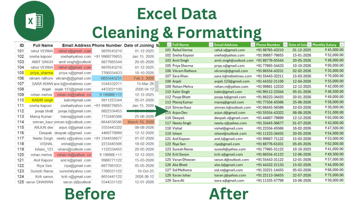 Many businesses and individuals struggle with Excel files that become difficult to manage over time. Incorrect data, duplicate rows, mixed date formats, and poorly formatted text can lead to confusion and wrong decisions. My goal is to help you organize your Excel data so it becomes reliable, readable, and ready to use.