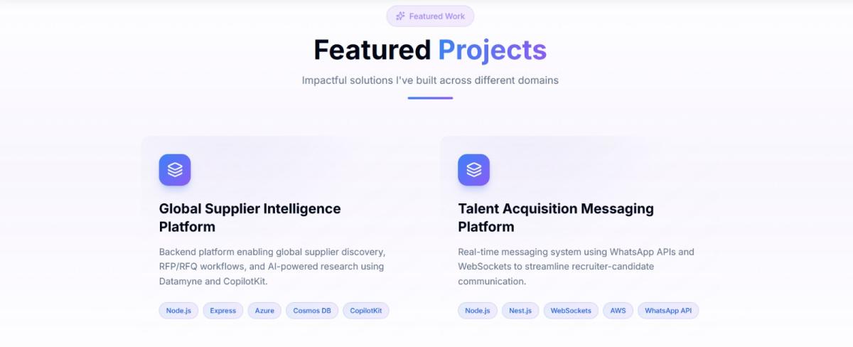 My database experience includes PostgreSQL, MongoDB, Redis, DynamoDB, and Azure Cosmos DB, along with ORMs like TypeORM and Sequelize.I have hands-on experience integrating third-party APIs such as Google APIs, WhatsApp, Zoho, Datamyne, and payment or notification services. I’ve also built real-time features using WebSockets and background jobs using queues and cron-based scheduling.