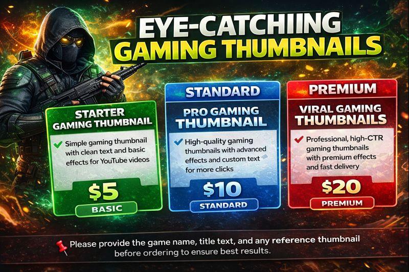I design high-quality gaming thumbnails that are eye-catching, professional, and made to increase clicks and views. My thumbnails are perfect for YouTube gamers, streamers, and content creators who want their videos to stand out in a competitive feed. I focus on bold colors, clean text, strong lighting, and effects that match your gaming style. I create thumbnails for games like Minecraft, Fortnite, Valorant, BGMI, Free Fire, and more. Each thumbnail is custom-designed, delivered in high resolution, and optimized for YouTube standards. I offer fast delivery and revisions to make sure you’re fully satisfied. If you want thumbnails that look professional and attract more viewers, I’m here to help you level up your content. 🎮🔥