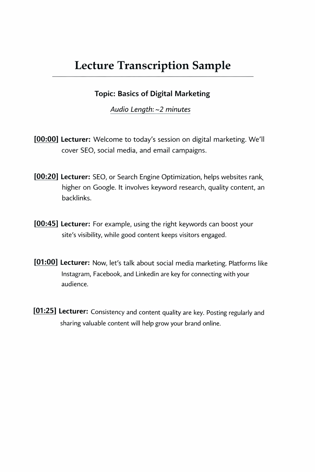 I offer reliable transcription services that transform audio and video content into precise, readable documents. Every transcript is carefully reviewed for clarity, grammar, and consistency.