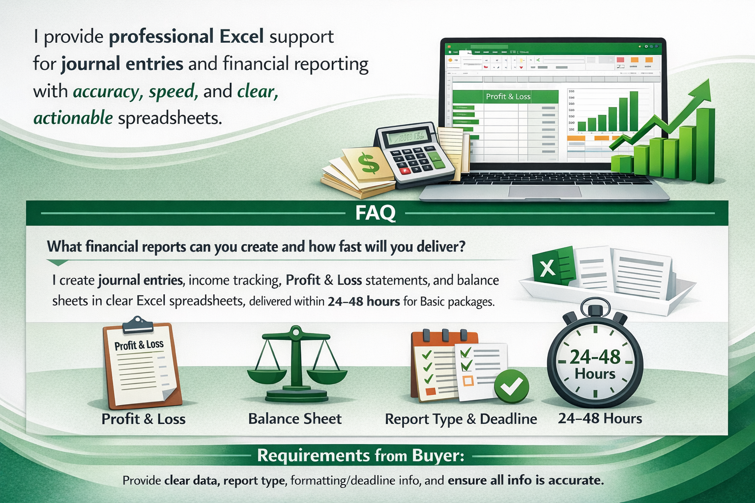 I create journal entries, income tracking, and summaries like Profit & Loss statements or balance sheets, all in clear Excel spreadsheets, usually delivered within two days for Basic packages, depending on complexity.